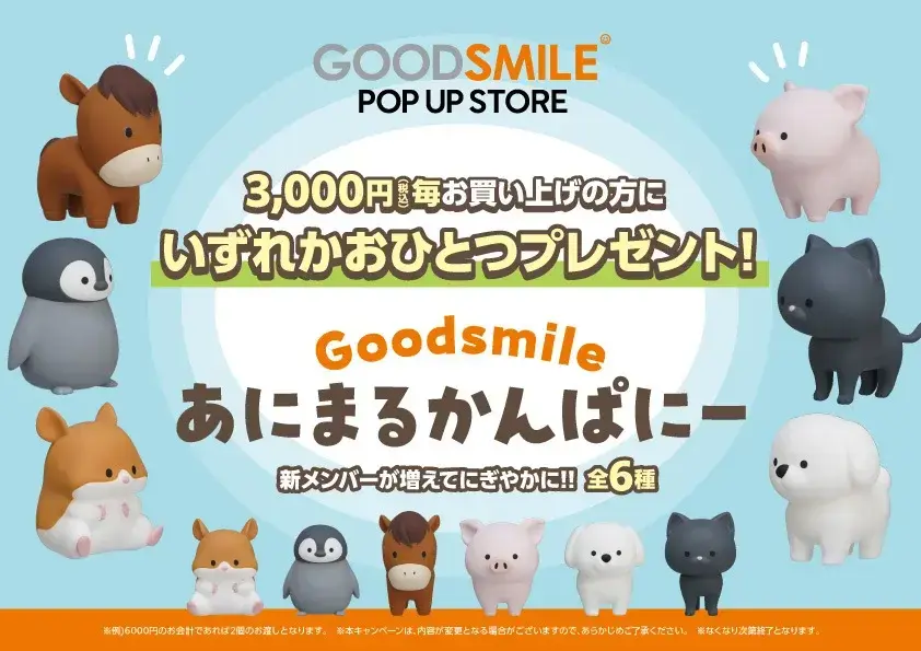 POP UP STORE開催期間中、対象商品:3000円毎お買い上げの方に【Goodsmile あにまるかんぱにー】の動物フィギュア(いぬ、ねこ、ぶた、うま、ぺんぎん、はむすたー)をランダムで1個プレゼント!