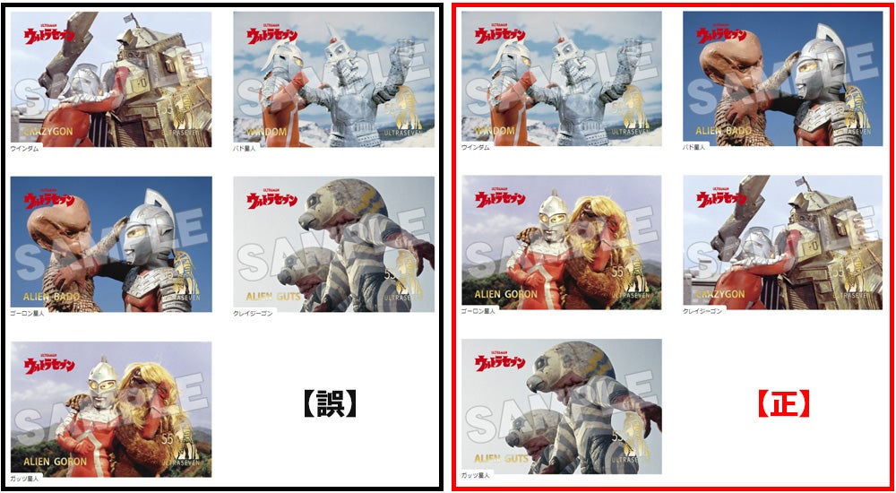 4月8日(月)にご案内いたしましたジュウロクホウイ商品「ウルトラセブン55th 飾れる色紙ハガキ」各種の商品画像におきまして、一部誤りがございました。