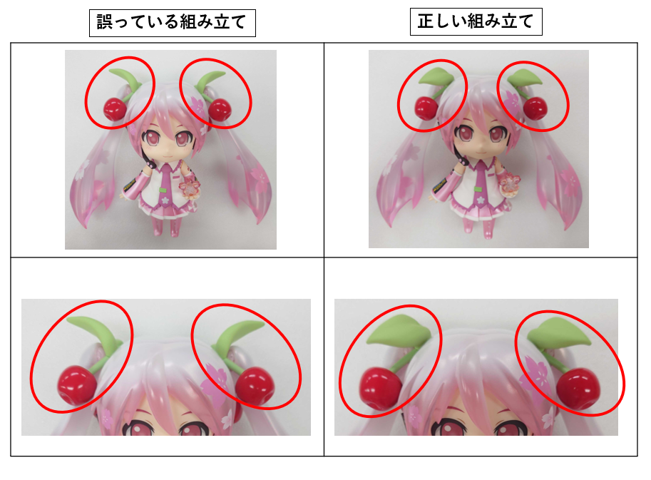 髪飾り(さくらんぼ)が左右逆で組み立てられておりました。