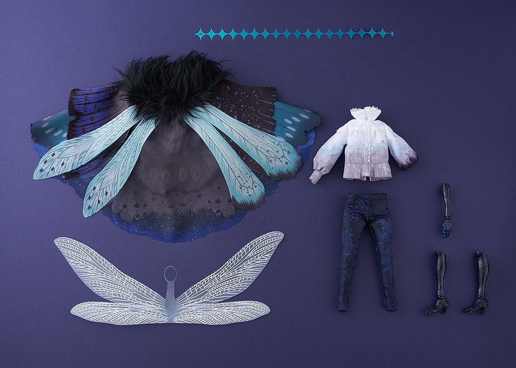 闇夜にゆらめくようなグレーのヘアカラーに、新規デザインによるメイクや染色をしたようなブラウス、幾重に重ねられた異なる素材の翅など忠実に再現。さらに昆虫のようなフォルムの左腕と脚は植物少女園の石長櫻子氏による新規造形です。