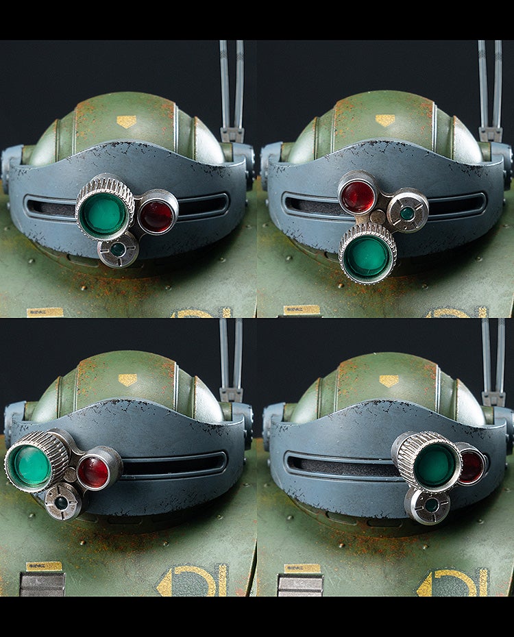 「ロボ道 スコープドッグ」にはプレイアビリティを向上させる様々なギミックも搭載。コクピットを露出させるにあたって、頭部バイザー、胸部コクピットハッチ、そして腹部メンテナンスハッチが開閉可能。コクピットシートにはAT用スーツを纏った「キリコ・キュービィー」のフィギュア(非可動)を着席できます。「ロボ道 スコープドッグ」のバイザー部の「ターレットレンズ」は回転でき、カメラの異なるズーム使用状態を再現可能。両前腕部には「アームパンチ」再現用の伸縮ギミックを搭載。脚部は変形し、降着姿勢が再現可能です。また、足の裏には「ローラーダッシュ」用のタイヤを内蔵しており、つま先を引き上げることでタイヤが展開します。さらに、両足の側面に装着した「ターンピック」も伸長可能です。腰部パーツの背面にはポリマーリンゲル液交換孔のスライドハッチのディテールが、そして腰部パーツの下面にはポリマーリンゲル液中和剤のタンクのディテールがモールドされています。