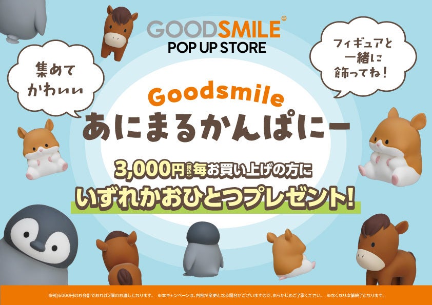 於快閃店開幕期間中購買對象商品,結帳每3,000日圓將隨機贈送「Good Smile動物夥伴」的動物模型(狗、貓、豬、馬、企鵝、倉鼠)1個!